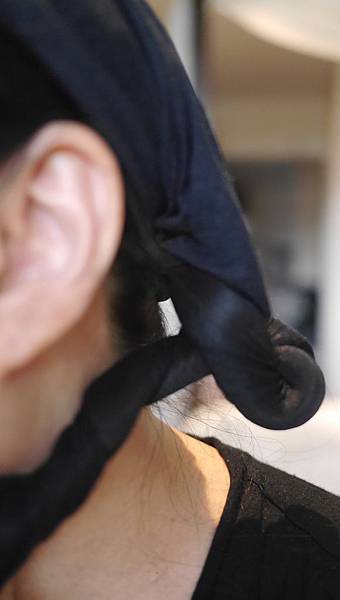 頭髮兩邊塞好,再把褲襪鬆緊帶套至頭上