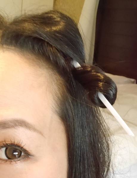 把半邊頭髮套進一邊褲襪裡