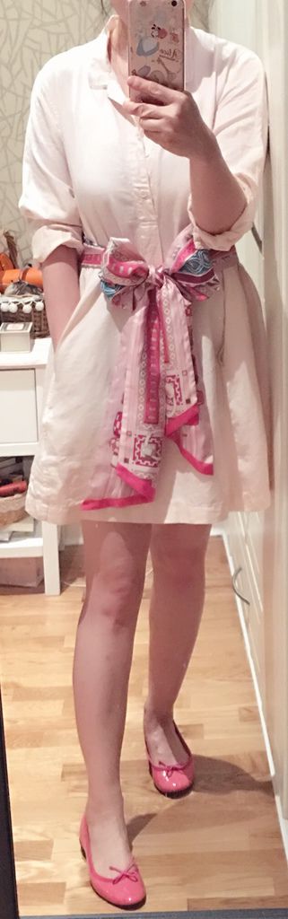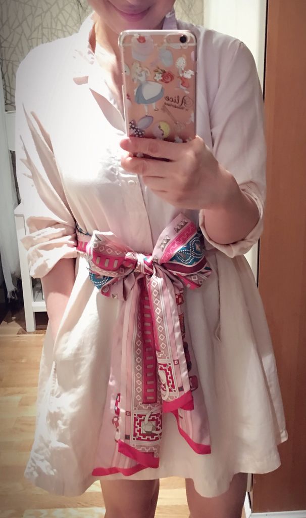 Hermes Maxi Twilly結一個大大的蝴蝶結,因為衣服本身很簡單,這樣不會太誇張,反而顯腰細