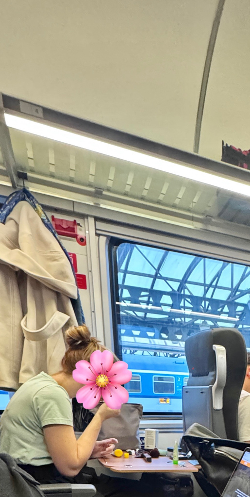 火車隔壁坐了一位美妝部落客,正以嫻熟手法描繪妝容