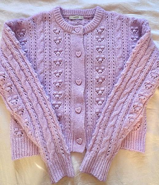 這件丁香色開襟毛衣來自波蘭Zara-Reserved,材質一般,羊毛含量只有個位數,但敵不過它花紋可愛,價格便宜,扣子,還是愛心型😍